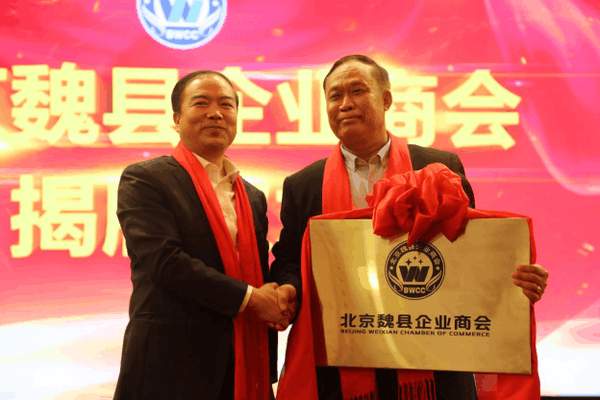 魏县人民政府县长樊中青(左)为北京魏县企业商会揭牌