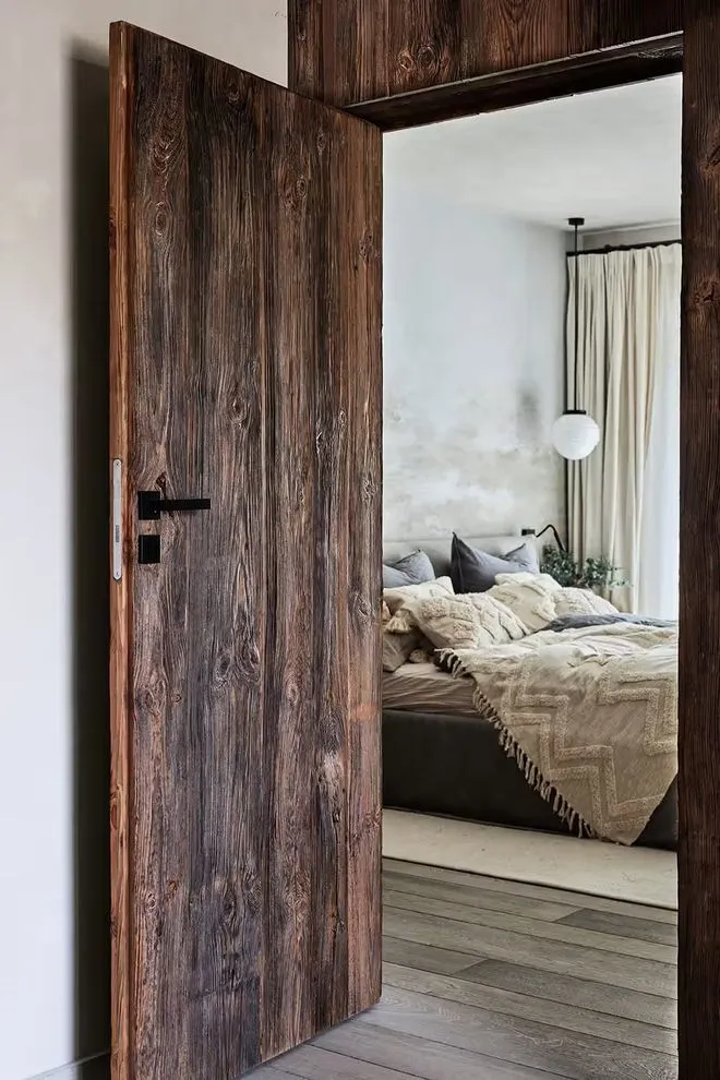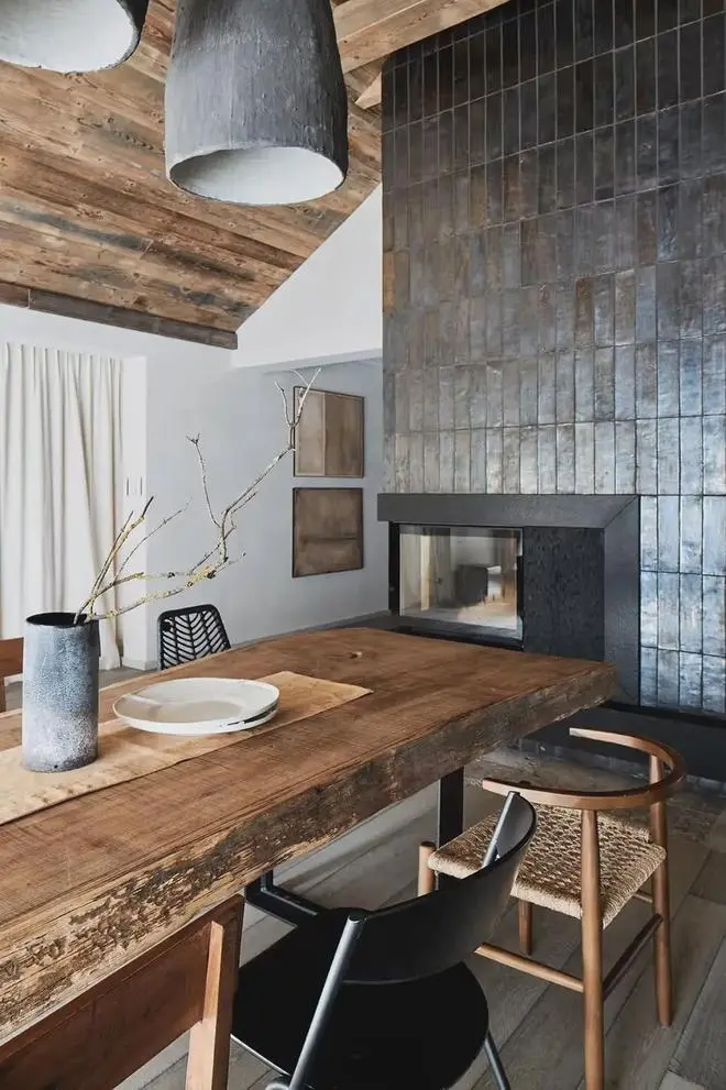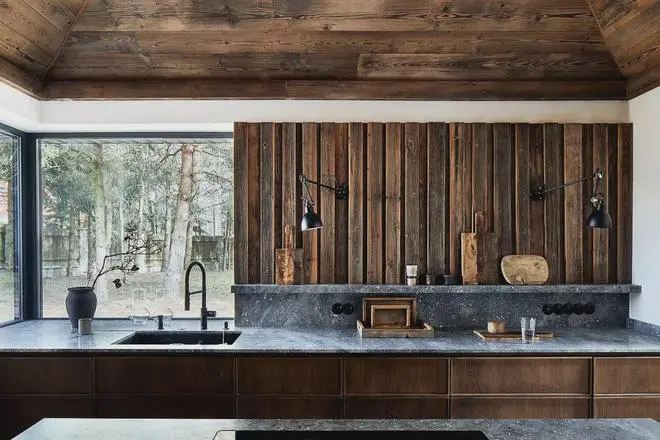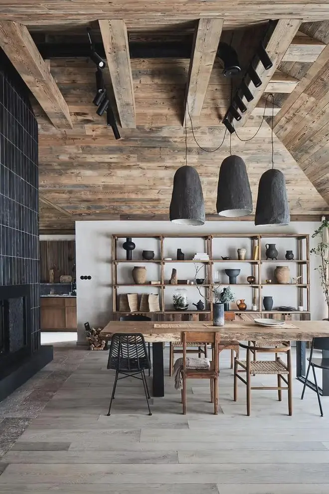 建筑外立面以粗犷木构件与大面积玻璃窗组合而成,内外通透,自然风光与室内生活无缝连接。空间整体以陈年木材为核心元素,设计师选用风化松木、橡木和百年老木料,通过现代木饰面与定制家具的演绎,使空间既具岁月质感,又不失当代气息。
