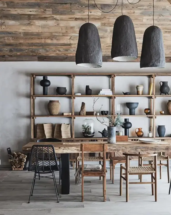 客厅采用暖色调木板包裹,营造温馨氛围。百年松木打造的原木架与回收木板制成的咖啡桌相互映衬,结合柔软的座椅布置,呈现自然随性的生活质感。餐厅中的橡木长桌庄重而不沉重,既是聚会核心,也是家居灵魂所在。